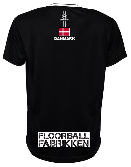 Super flot landsholds udebanesæt - Unihoc spillesæt med t-shirt, shorts og strømper i stilfuldt design inkl. Floorball Danmark logo og Floorballfabrikkens logo