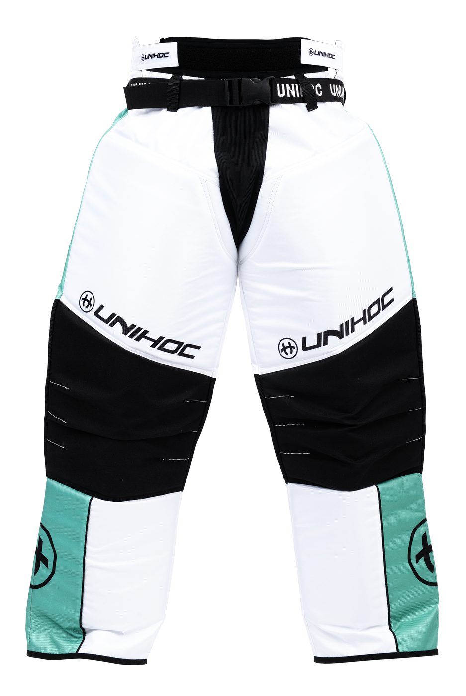 Dette par hvide/tyrkise KEEPER floorball målmandsbukser fra Unihoc er en super flot model, som er lavet i det kraftige Oxford nylon, så levetiden på målmandsbukserne øges.