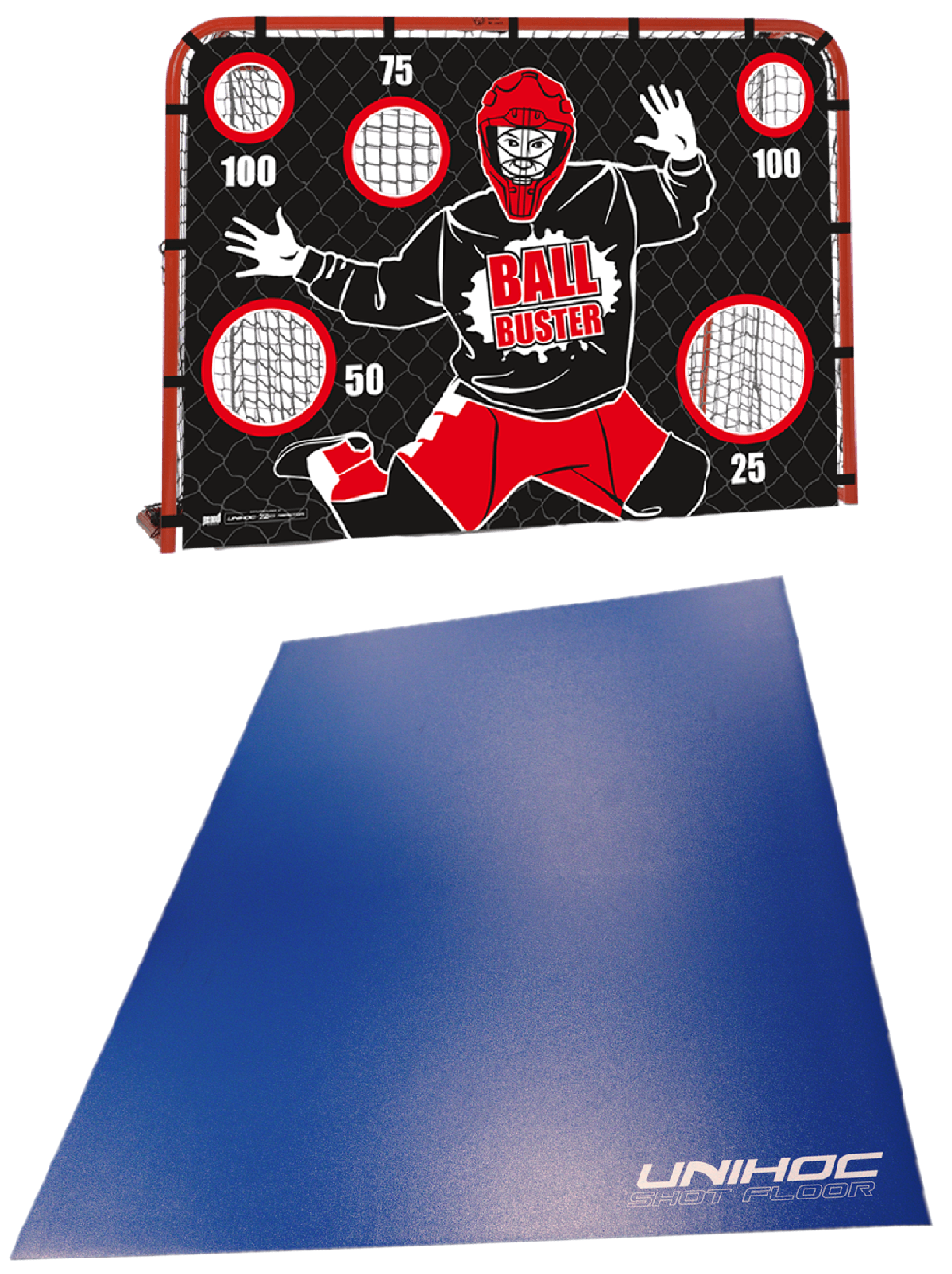 Dette floorball trænings sæt består af et solidt KAMPMÅL H:115xB:160 cm. Et floorball Ball Buster forhæng i samme størrelse som passer til målet samt et Unihoc shot floor - Gerflor floorball skud underlag (150x115x0,6 cm.)