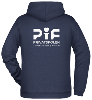Hættetrøjen er mørkeblå og har påtrykt PiF logo på venstre bryst samt stort flot logo på ryggen, hvilket er med i prisen.